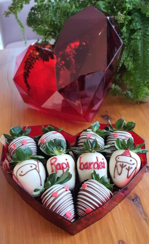 Linda caixa em acrílico vermelho com 10 morangos cobertos com chocolate ao leite e branco.