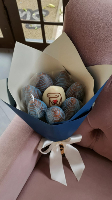 Buquê com 7 morangos cobertos com chocolate ao leite e branco.