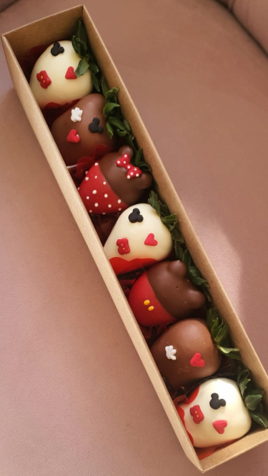 Caixa com 7 morangos cobertos com chocolate branco e ao leite e decorações do mickey e minnie.