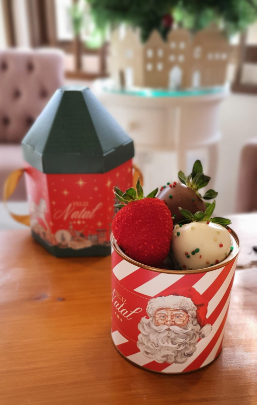 Latinha de Natal com 6 morangos cobertos com chococolate ao leite, branco e açucar veremelho.